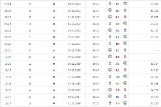克洛普的利物浦vs瓜迪奥拉的曼城交手战绩