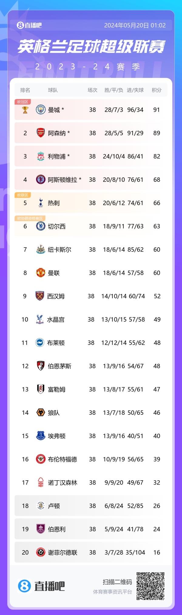 热刺锁定欧联资格,曼联第8名创队史英超最差排名,他们将寄希望于足总杯决赛(对阵曼城)来争夺欧战资格。切尔西锁定欧战资格,蓝军和纽卡的欧战资格情况取决于曼联的足总杯决赛赛果。
