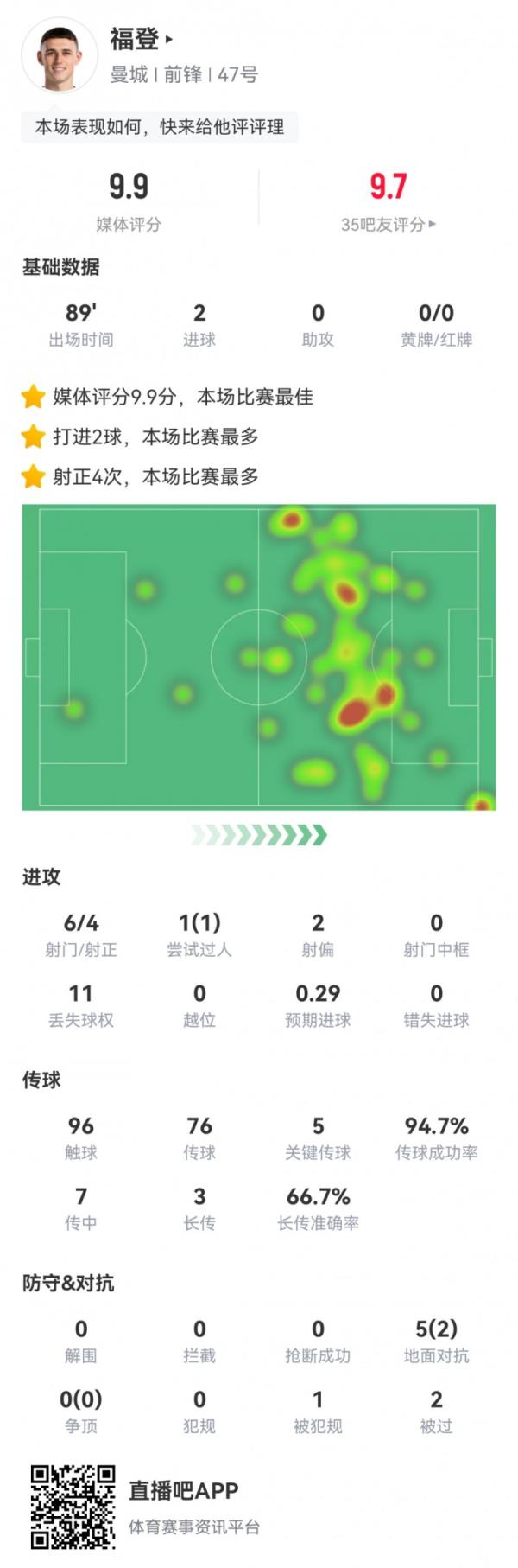 5月20日讯 英超末轮,曼城3-1西汉姆完成史无前例的四连冠伟业。此役福登首发出战89分钟发挥出色双响建功,球员全场重点数据如下↓