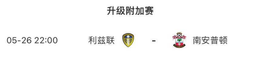 英冠升级方面,莱斯特城夺得冠军,和排名第二的伊普斯维奇获得直升英超的资格,北京时间5月26日22点,利兹联将和南安普顿进行升级附加赛决赛,决出本赛季最后一个升级英超的名额。