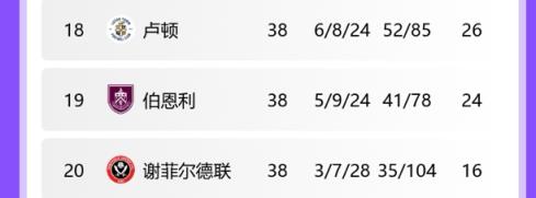 英超降级方面,三支升班马:卢顿、伯恩利、谢菲尔德联位列倒数前三,全部降级。