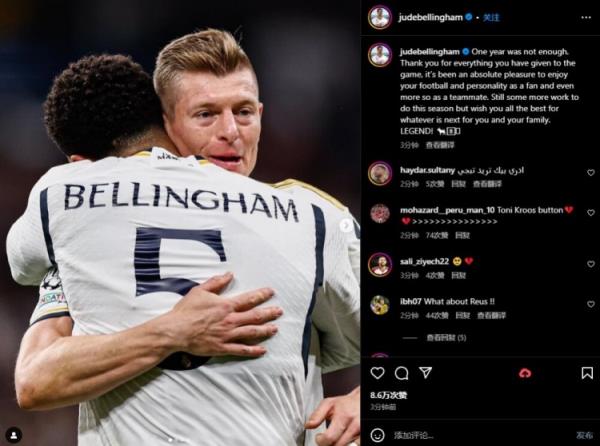 贝林厄姆:一年的时间是不够的。感谢你为足球所做的一切,作为球迷,享受你的足球和个性绝对是一种享受,作为队友更是如此。本赛季还有一些工作要做,但无论你和家人接下来会怎样,都祝愿你一切顺利。传奇!