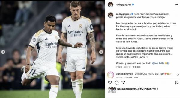 罗德里戈:托尼,即使在我最疯狂的梦里,也未曾想过能够和你一起经历这么多的事情。非常感谢你对于我的每一次教导、你的每一个进球、助攻、我们一起赢得所有冠军以及你在足球界所做到的一切。这对于皇马球迷和所有热爱足球的人来说都是一个悲伤的消息,我们都会想念拥有托尼-克罗斯的比赛。但是你是一个令人无法忘记的传奇,祝福你一切顺利,愿你永远快乐,这个故事还有一个非常重要的篇章,让我们一起为15冠而战。