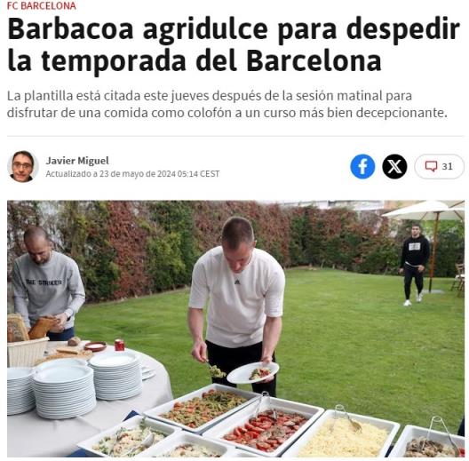 报道称,在本赛季的最后一次正式训练之前,巴萨教练组组织了球队本赛季的告别餐,最初的想法是在拉玛西亚设立一个户外烧烤区。预计整个球队的球员都会出席,其中甚至包括受伤的球员。