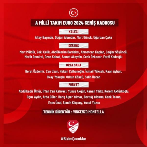前锋:阿卜杜勒卡迪尔-厄穆尔(赫尔城)、伊尔凡-詹-卡夫韦奇(费内巴切)、尤努斯-阿克金(莱斯特城)、凯南-伊尔迪兹(尤文图斯)、凯雷姆-阿克图尔科奥卢(加拉塔萨雷)、奥乌兹-艾登(阿拉尼亚体育)、阿尔达-居勒尔(皇家马德里)、巴里什-阿尔珀-伊尔马兹(加拉塔萨雷)、贝尔图-耶尔德勒姆(雷恩)、(贝西克塔斯)托松、埃内斯-于纳尔(伯恩茅斯)、塞米赫-克勒恰索伊(贝西克塔斯)、优素福-亚泽哲(里尔)