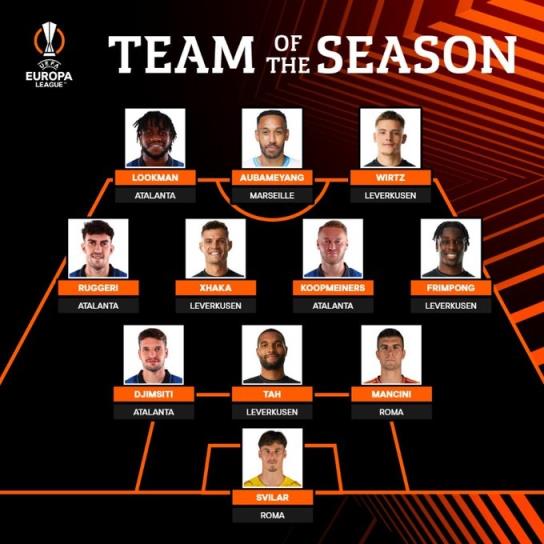 5月25日讯 2023-24赛季的欧联杯已经落下帷幕,亚特兰大以3-0的比分完胜勒沃库森拿到冠军。欧足联评选出了2023-24赛季欧联杯最佳阵,奥巴梅扬、维尔茨入选,扎卡、弗林蓬在列。