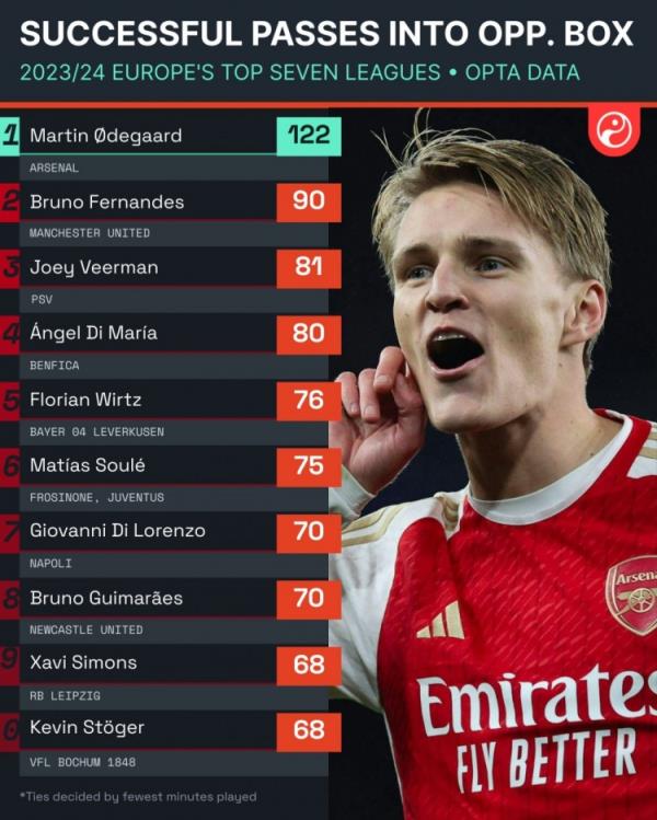 5月31日讯 知名足球数据机构Opta统计了2023-24赛季欧洲前七大联赛球员成功将球传进对手禁区的次数,其中,厄德高完成122次高居榜首,他也是唯一一位破百的球员。B费以90次排在第二。
