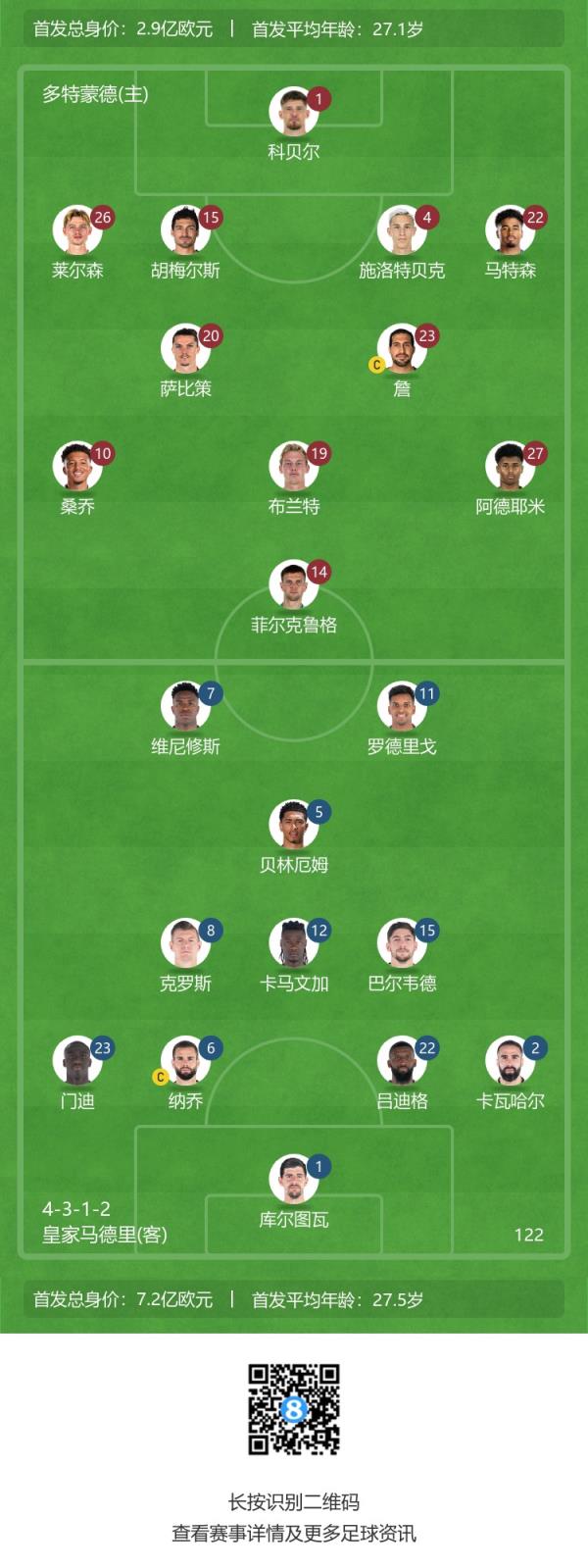 6月2日讯 23/24赛季欧冠决赛,多特vs皇马比赛即将打响。赛前首发出炉。