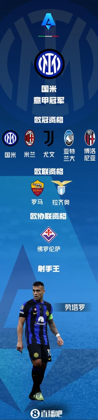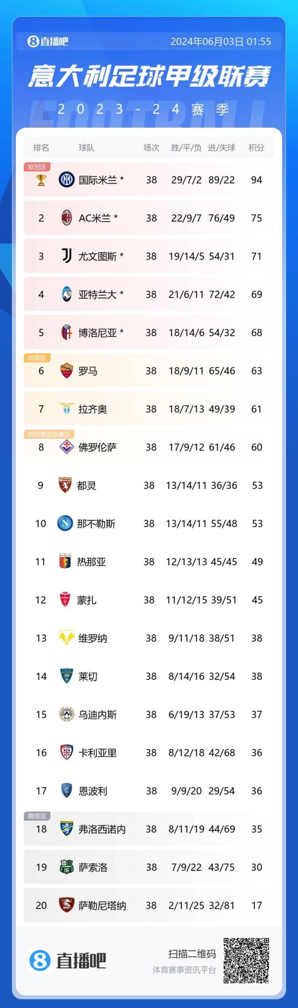 6月3日讯 23/24赛季意甲联赛收官,国米夺冠,AC米兰获亚军,尤文、亚特兰大、博洛尼亚分列3-5名,共5队获得欧冠资格。
