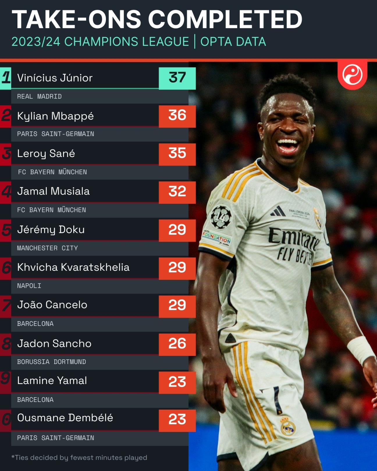 6月3日讯 据统计,维尼修斯是本赛季欧冠过人次数最多的球员,凭借着欧冠决赛的8次过人,他以37次排在第一位,姆巴佩36次第二。