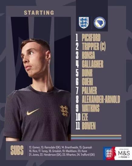 6月4日讯 北京时间今日2时45分,友谊赛英格兰对阵波黑,英格兰本场首发已公布,帕尔默、加拉格尔、阿诺德出战,特里皮尔任场上队长。