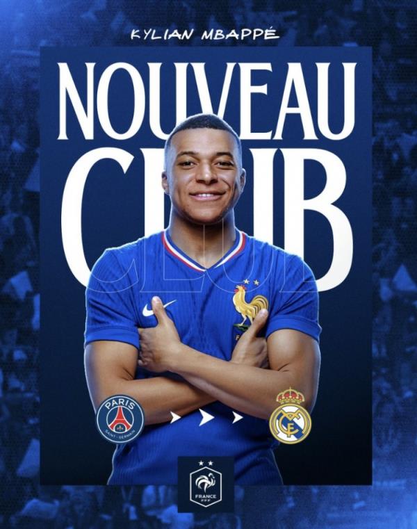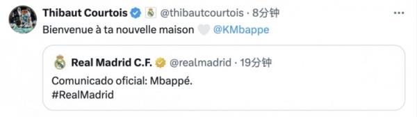 皇马官宣姆巴佩加盟,球队门将库尔图瓦转发文案欢迎新队友。