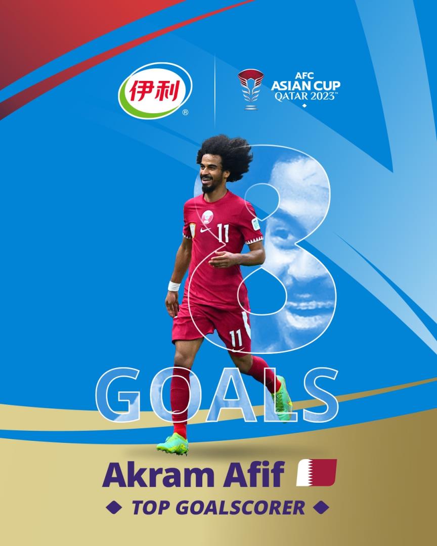 另外,阿菲夫是历史上第三位在单届亚洲杯打进至少8球的球员,其他两位是1996年的阿里-代伊(伊朗)和2019年的阿尔莫伊兹-阿里(卡塔尔)。