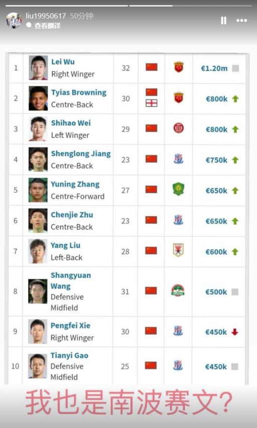 泰山球员刘洋以60万欧元排在第7位,他在个人社媒晒出德转中国球员身价榜,并调侃道:“我也是南波赛文?”