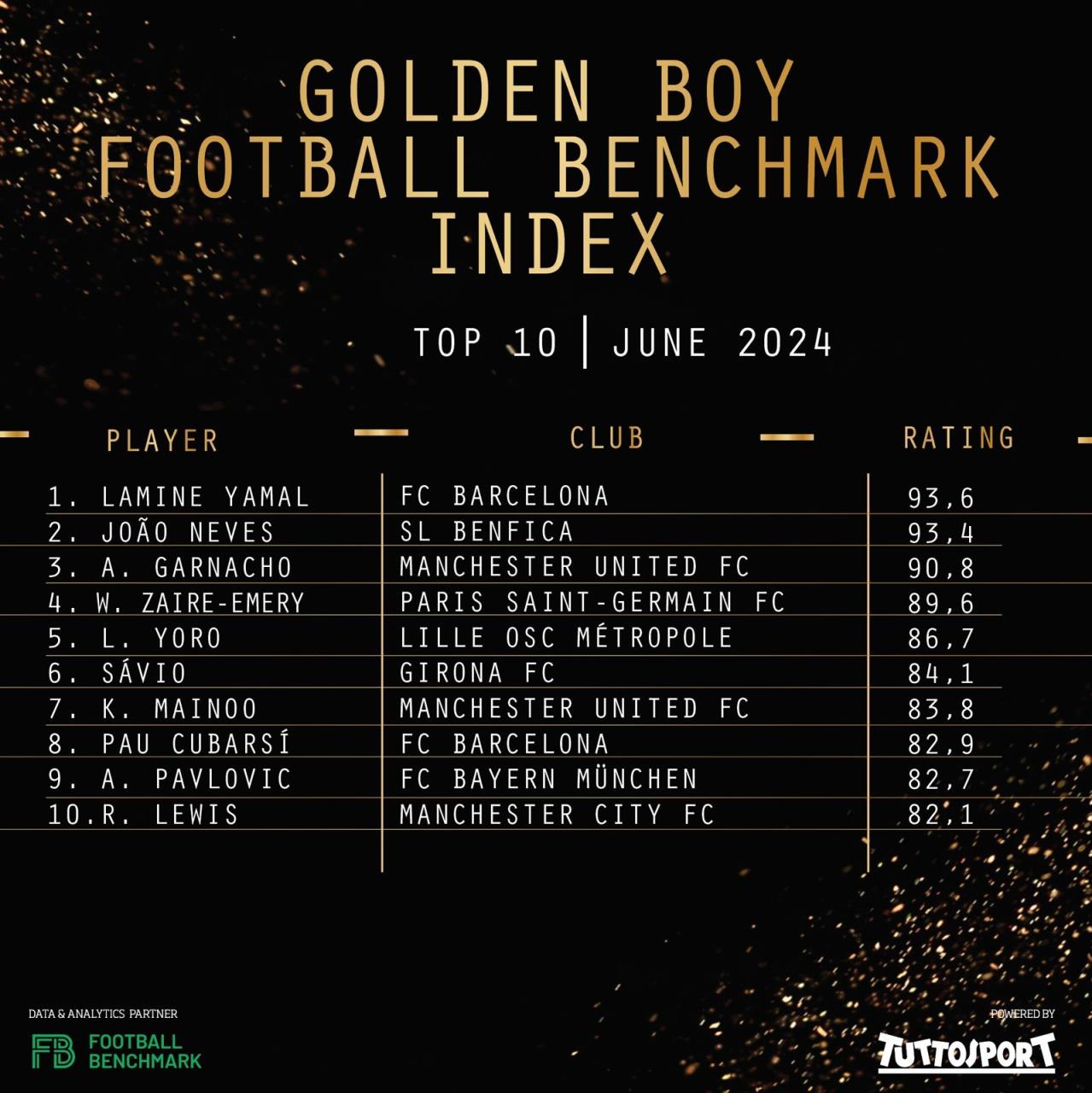 6月6日讯 金童奖官方公布了入围球员6月表现分,亚马尔居首,加纳乔位居第三。