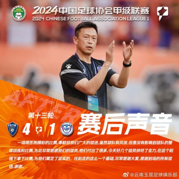 6月9日讯 在中甲联赛第13轮中,云南玉昆4-1轻取石家庄功夫。赛后的新闻发布会上,玉昆队代理主教练郭光琪将胜利献给球迷,并坦言球队的风波没有影响到训练和比赛。