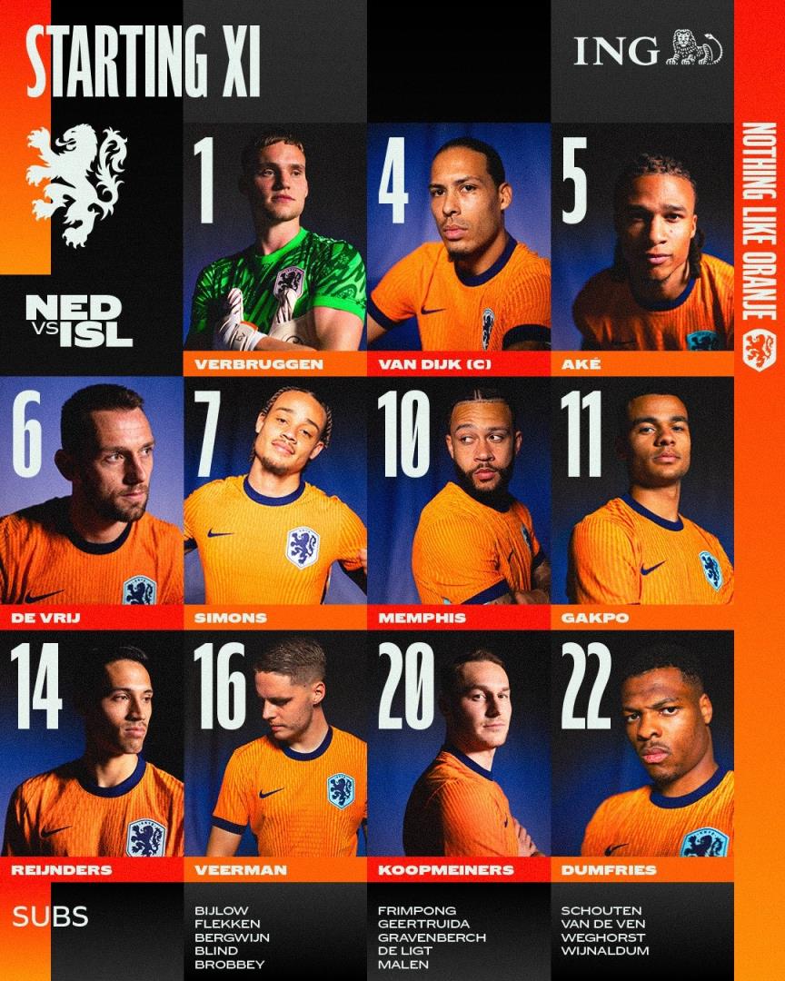 06月11日讯 友谊荷兰对阵冰岛,赛前首发公布。