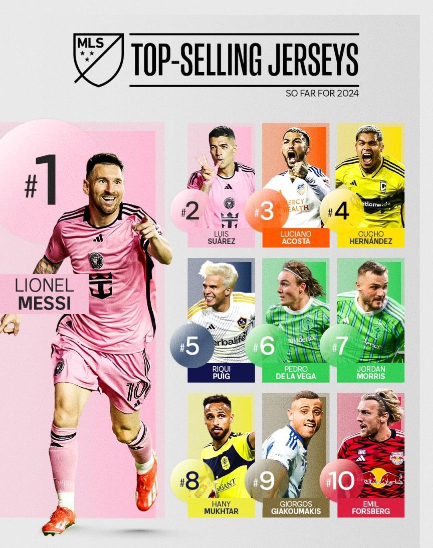 06月11日讯 美职联公布2024年至今球衣销售排行,梅西无悬念领跑,苏亚雷斯第二。