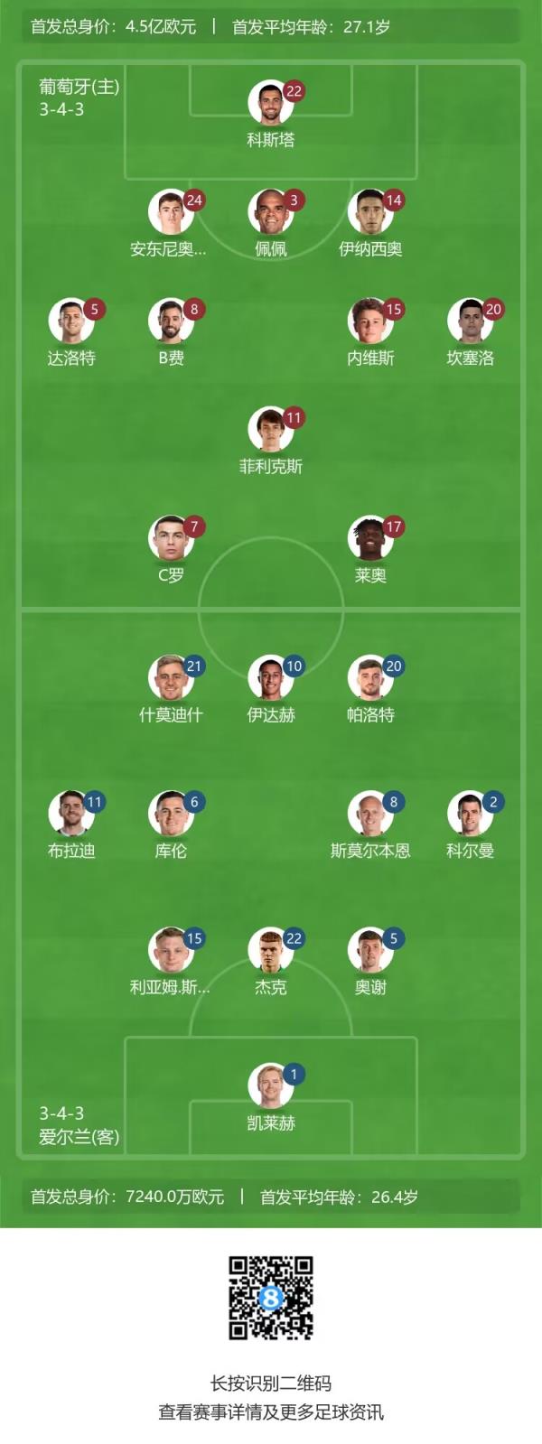 6月12日讯 足球友谊赛,葡萄牙对阵爱尔兰。赛前,官方公布了本场的首发名单。