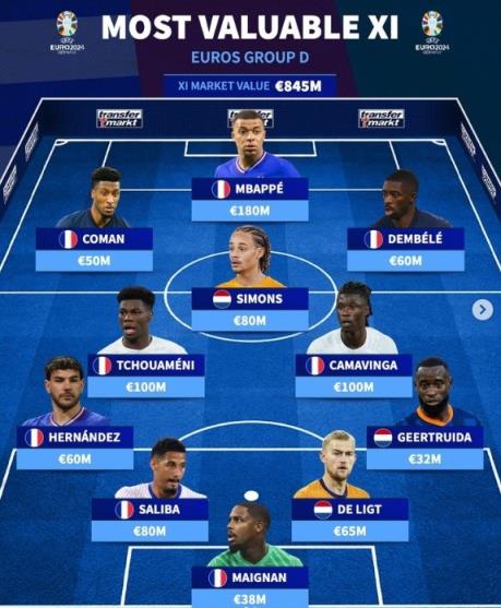 6月12日讯 欧洲杯D组由法国、奥地利、波兰、荷兰组成,《转会市场》也列出了本组最贵阵容,法国8将、荷兰3人。