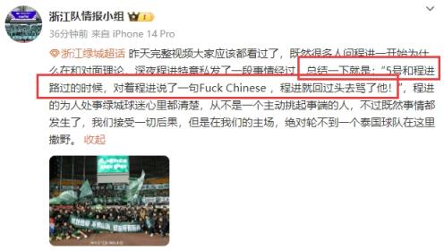 当时据博主“浙江队情报小组”透露,提拉通与浙江球员程进路过的时候,对着程进说了一句F*** Chinese,程进就回过头去骂了他。
