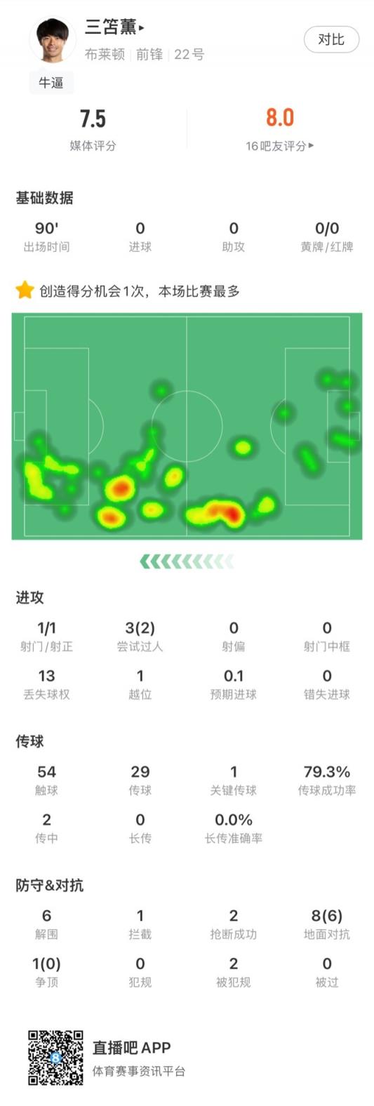 2月11日讯 英超联赛第24轮,布莱顿客场1-2遭热刺绝杀。本场比赛三笘薰为布莱顿首发踢满全场,获评队内第二高的7.5分。