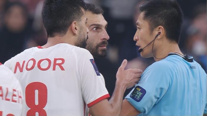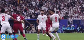 02月11日讯 亚洲杯决赛,约旦vs卡塔尔,比赛第81分钟,马宁判罚约旦球员犯规,卡塔尔获得任意球,约旦球员非常不满,围着马宁交流此次判罚。