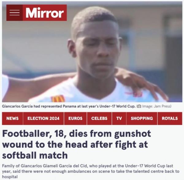 6月15日讯 镜报消息,一名巴拿马足球运动员在观看一场垒球比赛时与其他人发生争吵,随后不幸身亡。