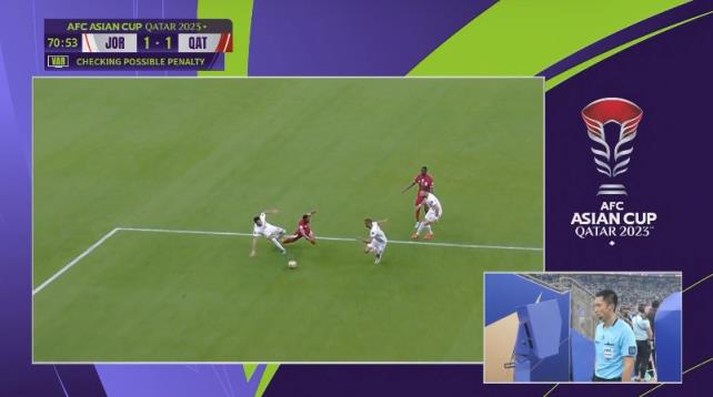 第69分钟,约旦球员马尔迪放倒了无球状态下的伊斯梅尔,主裁判马宁没有表示。1分多钟后死球, 马宁在VAR提示下迅速去场下回看,最终判罚卡塔尔获得点球,阿菲夫点射梅开二度,卡塔尔2-1再度领先。
