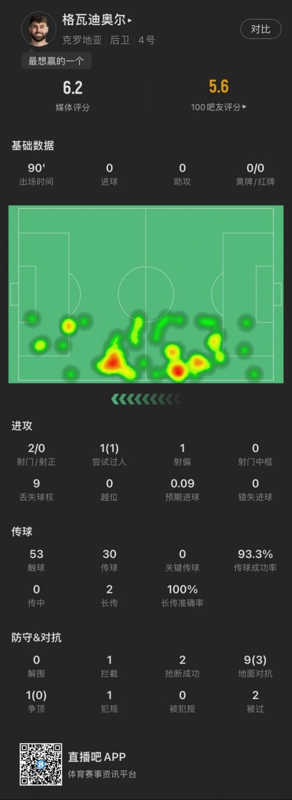 6月16日讯 在刚刚结束的欧洲杯小组赛中,克罗地亚0-3不敌西班牙。本场比赛,格瓦迪奥尔打满全场,仅获得Sofascore6.2分的评分,为全场最低。