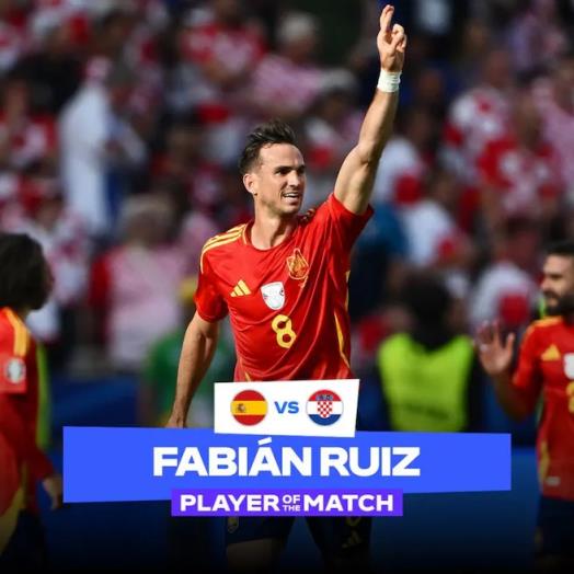 06月16日讯 官方消息,法比安当选西班牙3-0克罗地亚全场最佳球员,本场比赛法比安传射建功。