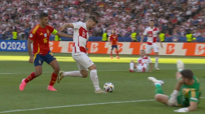 06月16日讯 西班牙vs克罗地亚第79分钟,西蒙送礼,罗德里破坏空门机会吃到黄点,佩里西奇疯狂抗议!