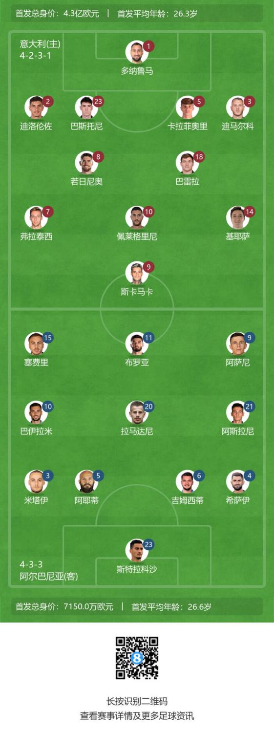 6月16日讯 欧洲杯小组赛B组第1轮,意大利对阵阿尔巴尼亚,赛前首发公布。