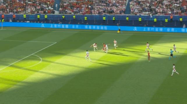 06月16日讯 欧洲杯B组首轮,西班牙vs克罗地亚,比赛第64分钟,16岁的亚马尔单挑克罗地亚整条防线,1v4连续两次变向直接晃倒庞格拉契奇,不过随后没有太好的机会,只能回传。