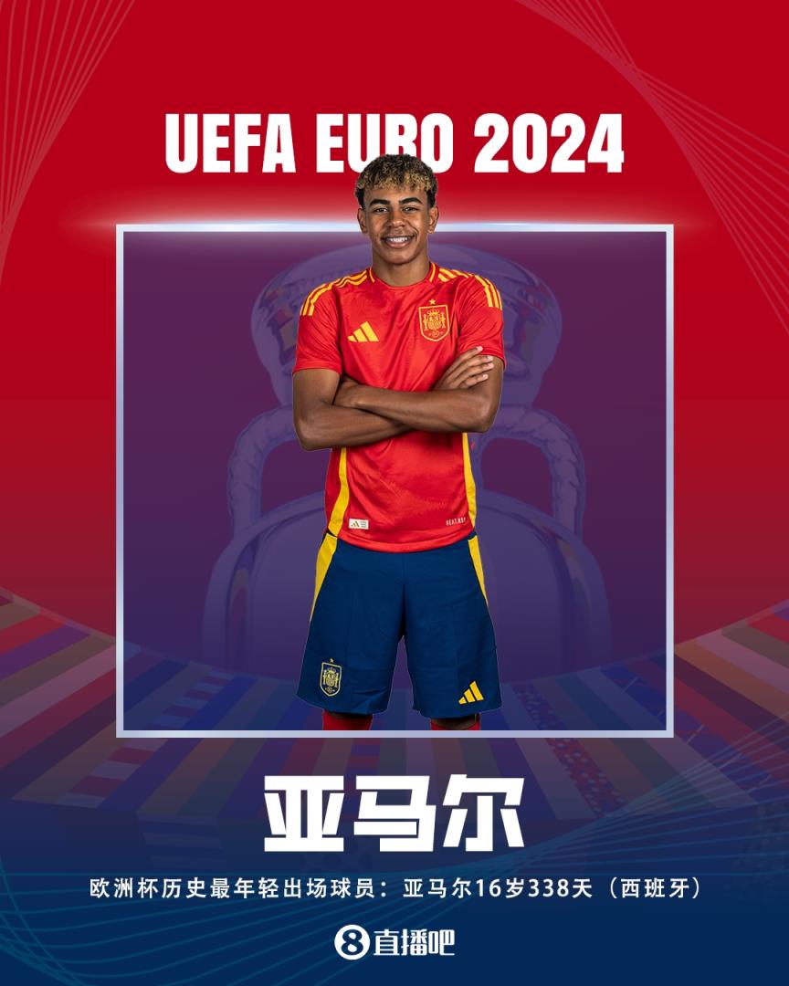 由于16岁338天的亚马尔是欧洲杯历史出场最年轻球员,今天他的任何表现都会创造欧洲杯的历史纪录。