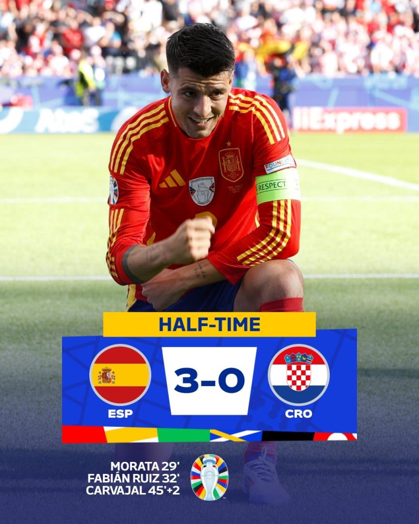 第29分钟,法比安-鲁伊斯中圈送出直塞,瞬间撕裂克罗地亚防线,莫拉塔前插获得单刀球机会,面对利瓦克维奇左脚推射破门,西班牙1-0克罗地亚。↓