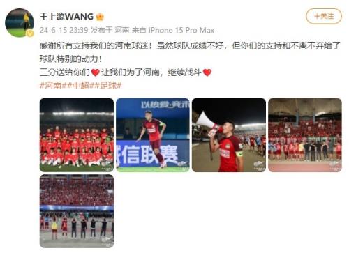 赛后河南队队长王上源在社媒晒出比赛照片,向河南队球迷表示感谢。他写道:“感谢所有支持我们的河南球迷!虽然球队成绩不好,但你们的支持和不离不弃给了球队特别的动力!三分送给你们,让我们为了河南,继续战斗!”