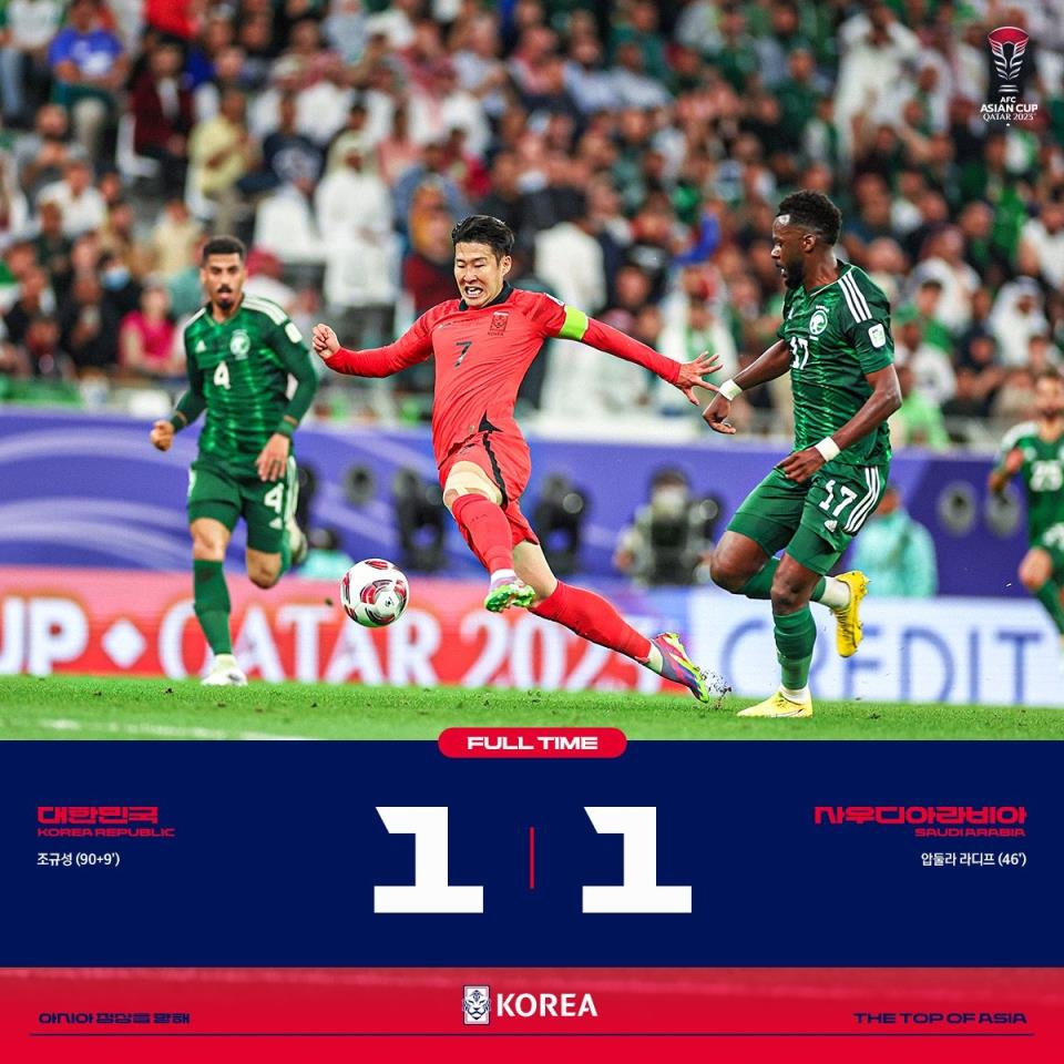 1月31日讯 北京时间1月31日0:00,亚洲杯淘汰赛十六强沙特迎战韩国的比赛,上半场孙兴慜低射造险,谢赫里和卡努头球中楣,半场结束,沙特0比0韩国。下半场刚开场拉迪夫单刀破门,曹圭成头球绝平,90分钟结束,沙特1-1韩国。