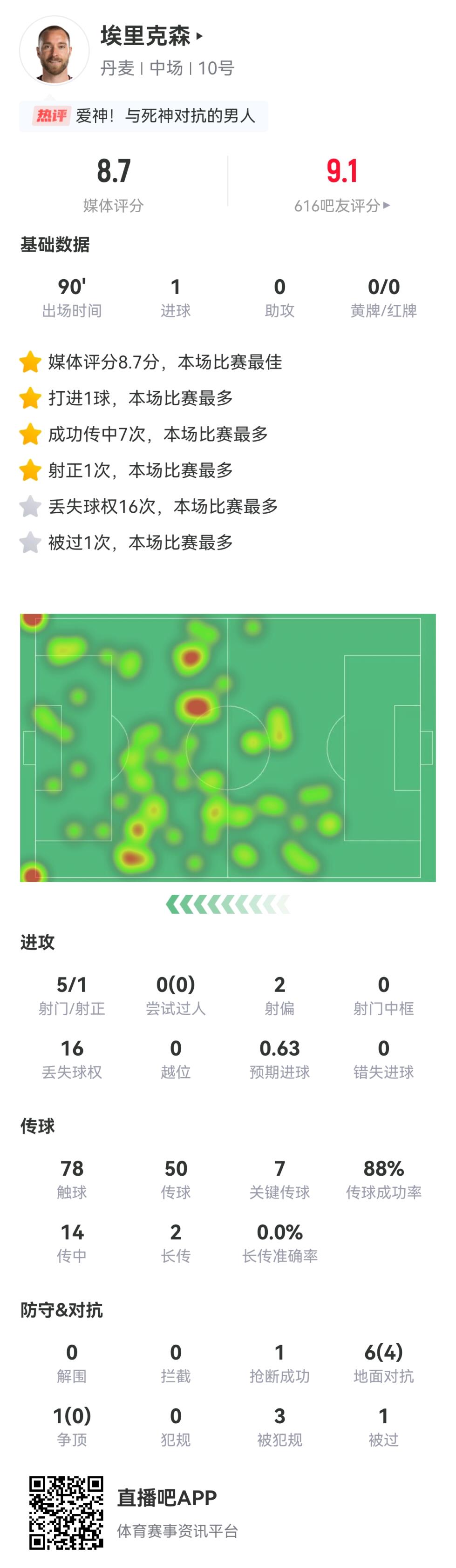 本场比赛埃里克森为丹麦打进1粒进球,贡献7次关键传球,评分8.7分全场最高。