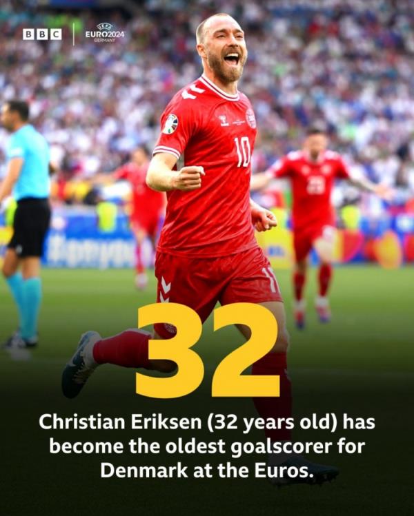 据统计,32岁123天的埃里克森成为丹麦在欧洲杯上最年长的进球者,同时也是丹麦在大赛中第三年长的进球者。