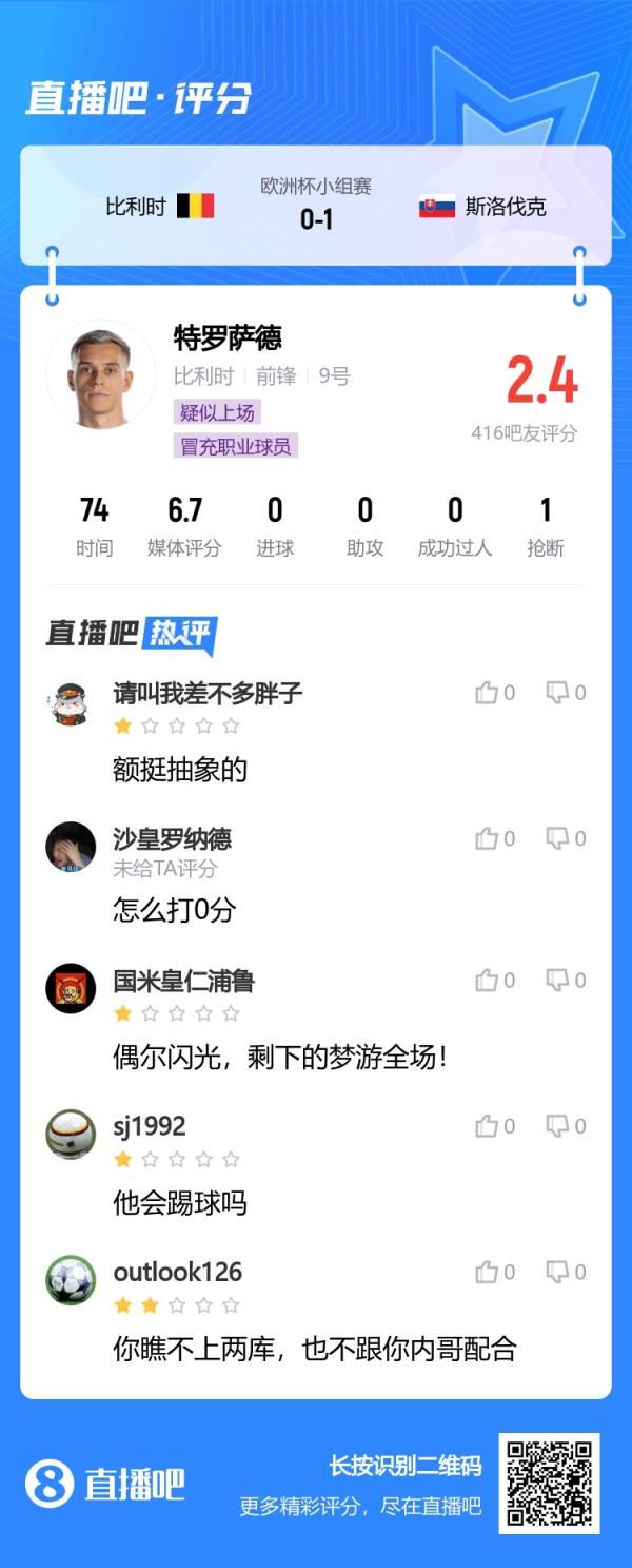 欧洲杯小组赛E组第1轮,比利时0-1斯洛伐克。特罗萨德首发出战但表现不佳,吧友给他打出2.4的低分。