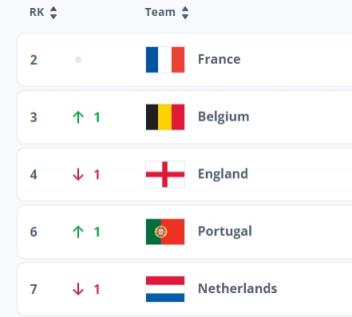 世界排名方面,这两支球队相差多达45位。比利时在最新一期国际排名中高居世界第三,欧洲范围排名第二仅次于法国。