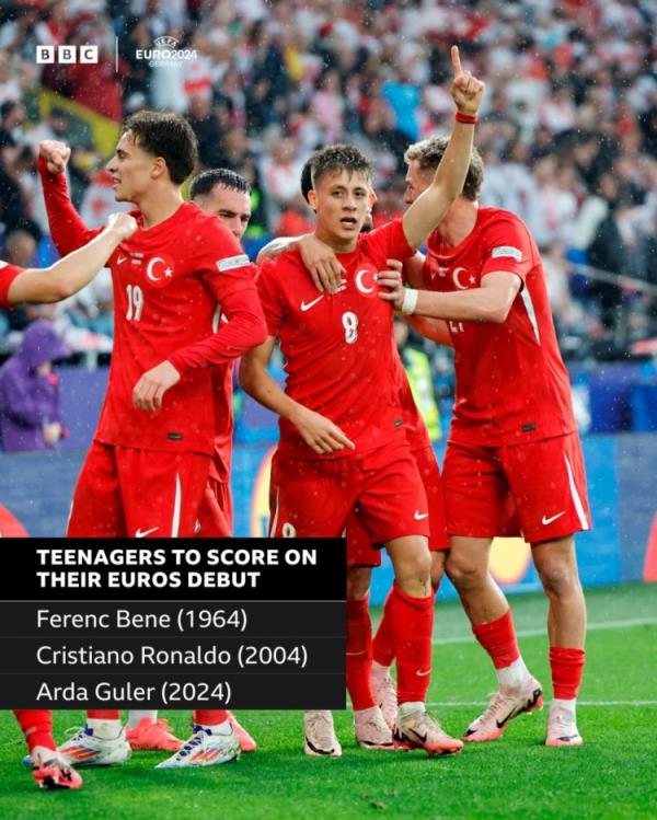 据统计,居勒尔成为欧洲杯历史上第三位首秀破门的青年球员,也是2004年的C罗之后首人。再往前是1964年的匈牙利球员拜奈-费伦茨。