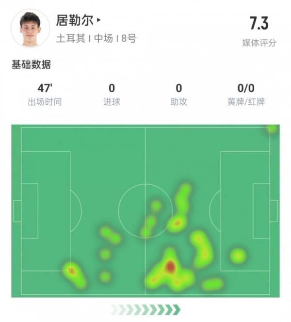 据统计,居勒尔上半场创造的机会比场上任何球员都多,他也是上半场唯一一位传球成功率100%的球员。
