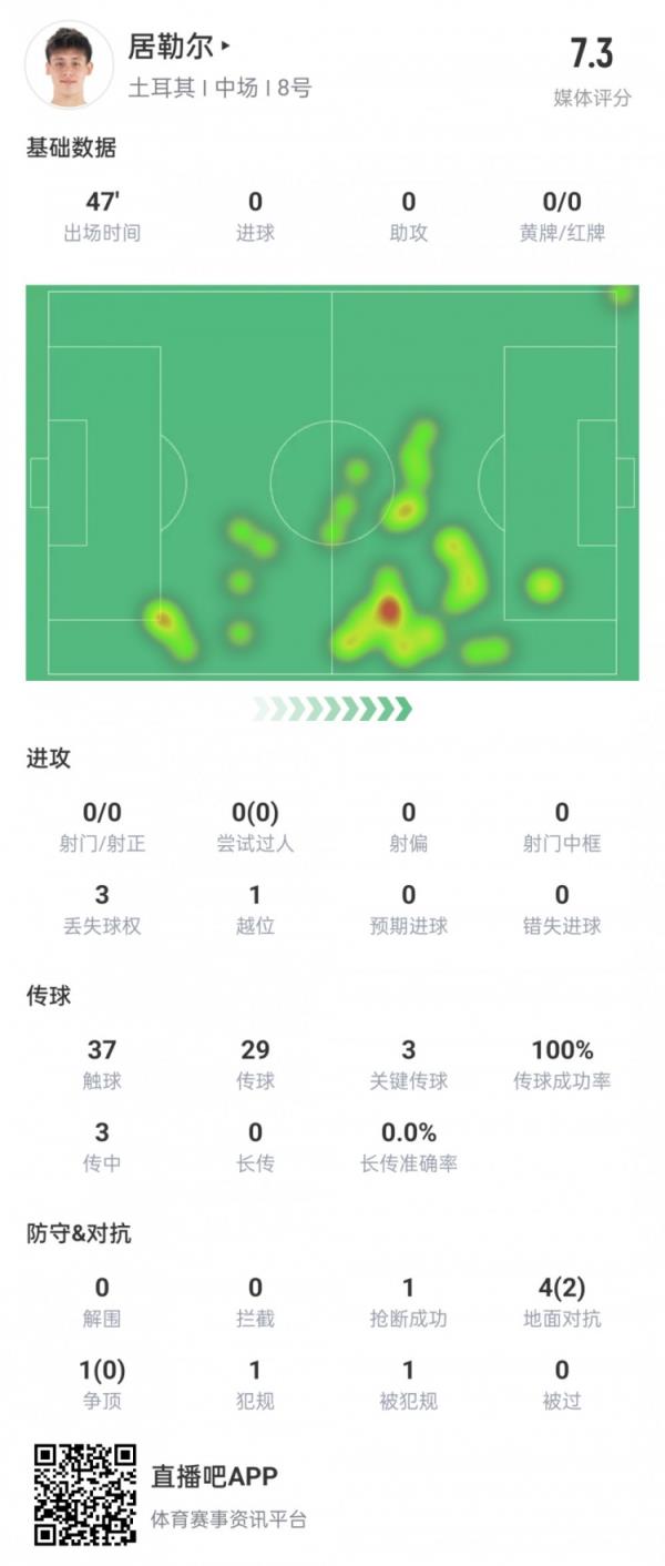 6月19日讯 欧洲杯小组赛F组第1轮,土耳其对阵格鲁吉亚,上半场1-1战平,19岁居勒尔半场数据如下。