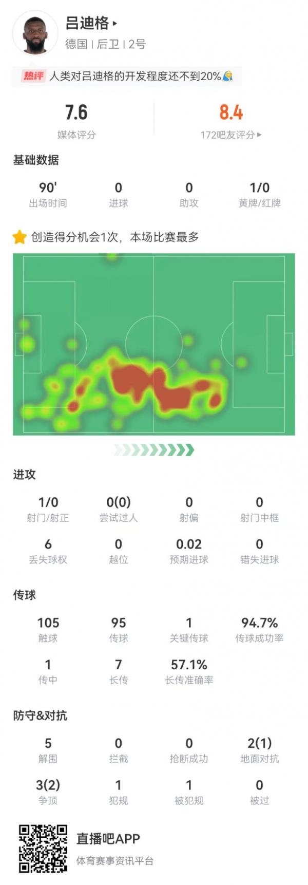 6月20日讯 德国在本轮欧洲杯2-0击败匈牙利,吕迪格本场数据如下: