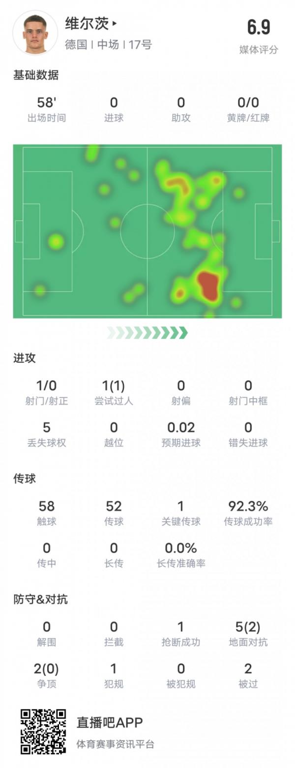 6月20日讯 欧洲杯小组赛A组第二轮比赛,德国对阵匈牙利,维尔茨代表德国队首发出战,贡献1次过人成功,1次关键传球,传球成功率达到92.3%,评分6.9。