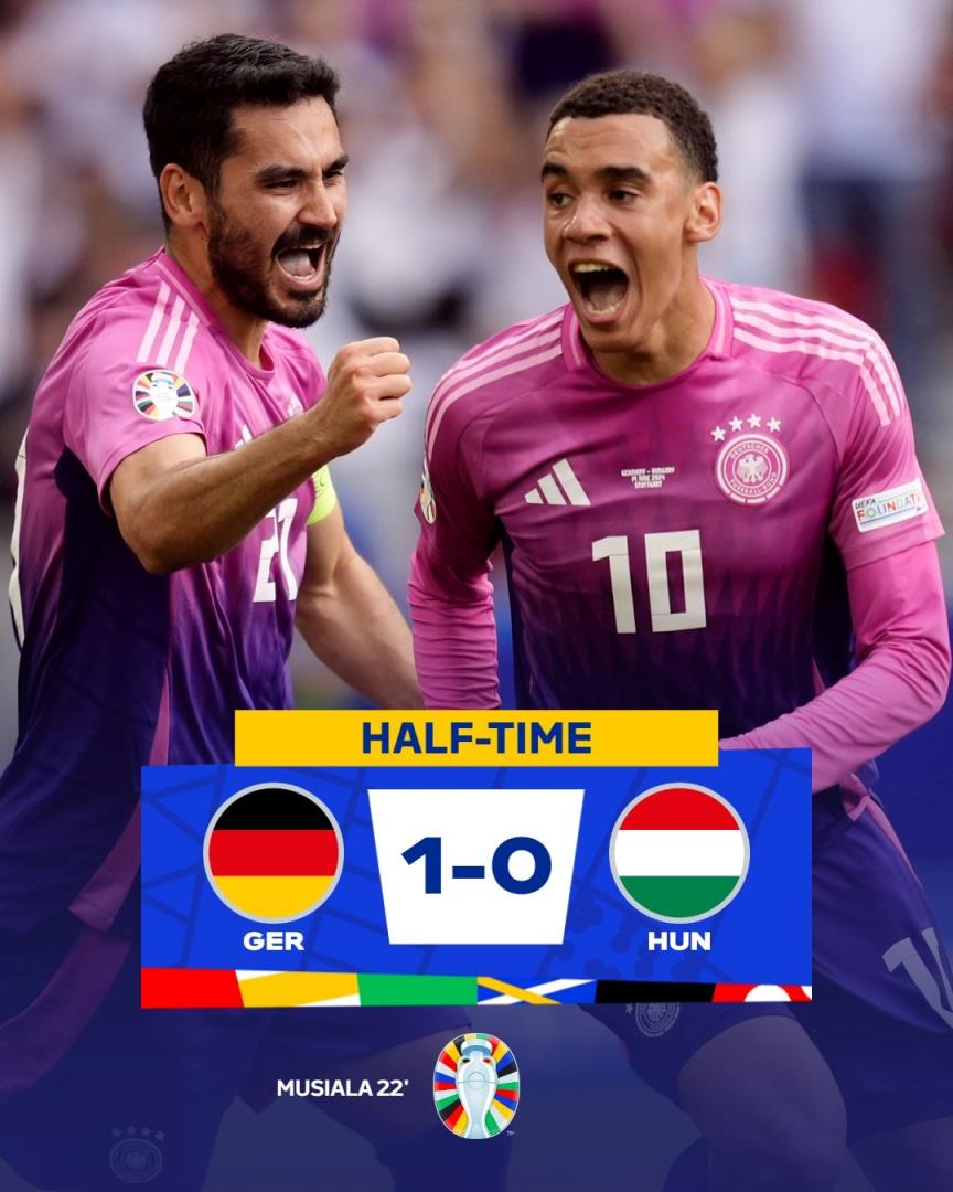 第22分钟,维尔茨横传给到穆西亚拉,后者直塞京多安,京多安对抗扛倒奥尔班,主裁判没有响哨,随后京多安再做球,穆西亚拉跟进攻门得手,VAR介入,确认进球没有问题,德国1-0匈牙利。↓
