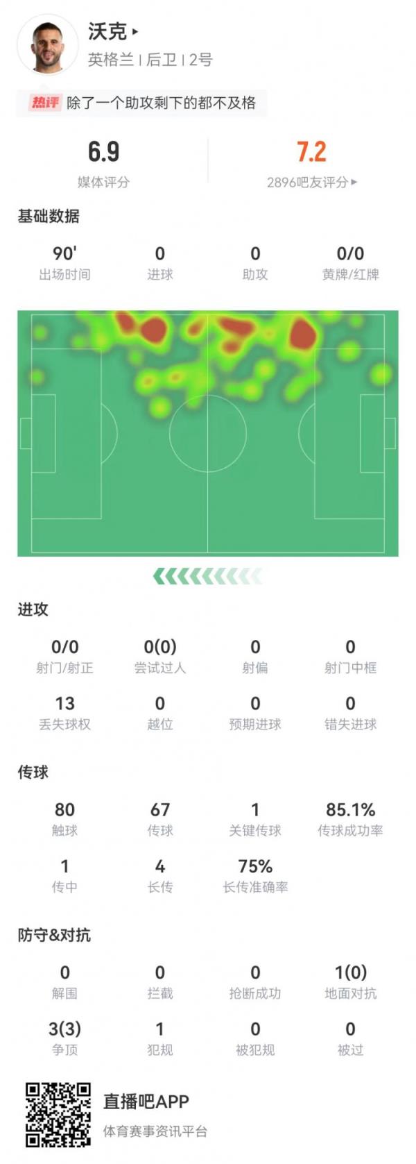 6月21日讯 英格兰在本轮欧洲杯1-1逼平丹麦,沃克本场数据如下: