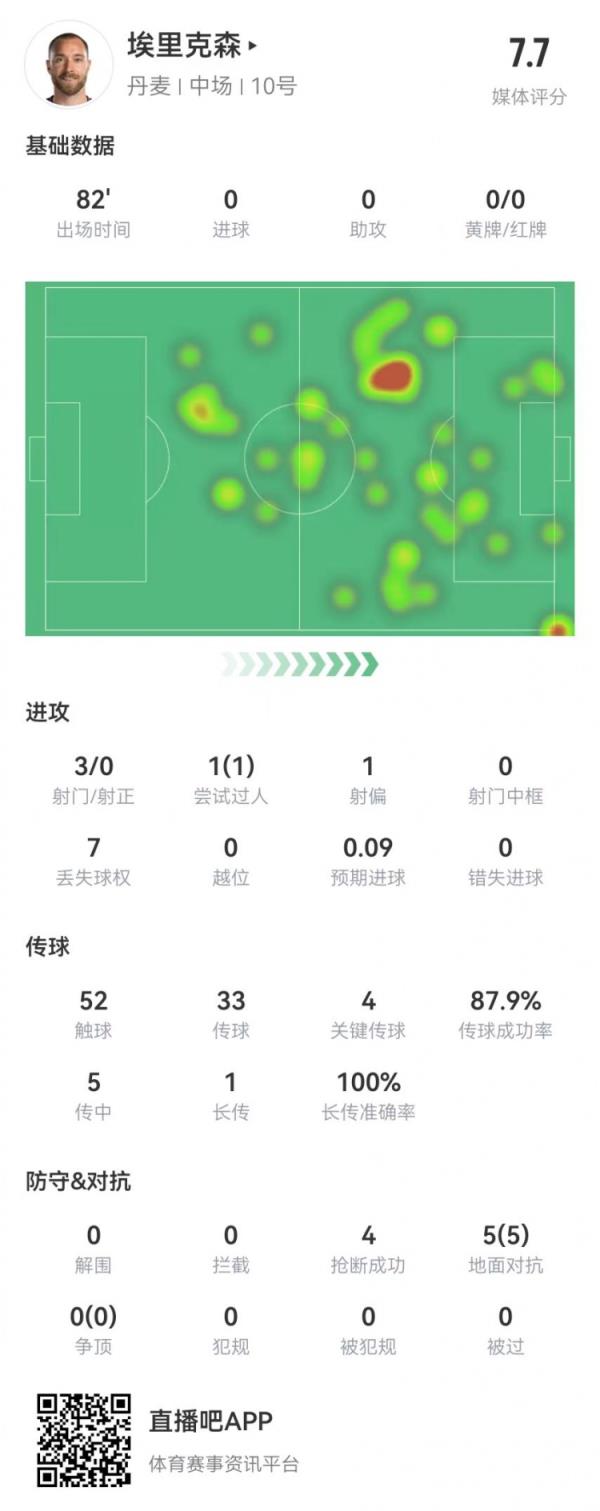 6月21日讯 丹麦在本轮欧洲杯暂时1-1战平英格兰,埃里克森本场数据如下:
